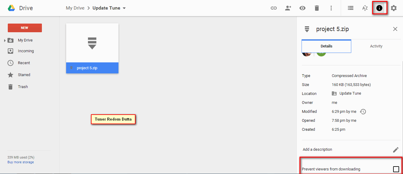 ফাইলটি আপলোড হবার পর,নিচের মত একটি ইমেজ দেখতে পারবেন,এর পর ফাইলটিকে সিলেক্ট করে ডানদিকের আইকনটিতে ক্লিক করে details যান সবার নিচে একটি ছোট বক্স আছে সেটিতে যদি টিক চীর্ণ দেয়া থাকে তবে তা উঠিয়ে দিন,এইটি উঠিয়ে না দিলে ইউজার রা ফাইলটি ডাউনলোড করতে পারবে না।