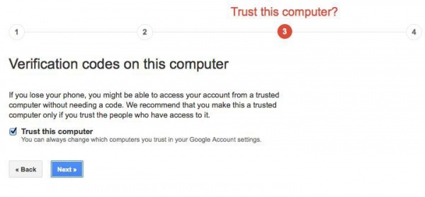 টু স্টেপ ভেরিফিকেশন সফলভাবে চালু হলে এরপর থেকে নতুন কোন ব্রাউজারে লগইন করতে গেলে সিক্যুরিটি কোড চাইবে এবং সেটি এন্টার করার পর ব্রাউজারটি “ট্রাষ্ট” করার অপশন আসবে। অর্থাৎ, আপনার নিজের পিসি বা মোবাইল হলে এর ব্রাউজার গুগল সার্ভারে “ট্রাষ্ট”/ “সেভ” করে নিতে পারবেন। এতে প্রতিবার লগইন করার সময় এসএমএস কোড দিতে হবেনা। শুধু ইউজারনেম (বা ইমেইল)- পাসওয়ার্ড দিলেই চলবে।