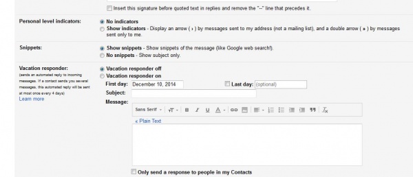এই বাটন থেকে Settings এ অথবা সরাসরি Settings এর ক্লিক করতে হবে। তারপর General tab এর একদম নিচের দিকে Vacation responder হতে Vacation responder on সিলেক্ট করতে হবে। Subject এবং Message ফিল্ড এ যা প্রয়োজন লিখে দিয়ে Click Save Changes. ব্যাস হয়ে গেল।