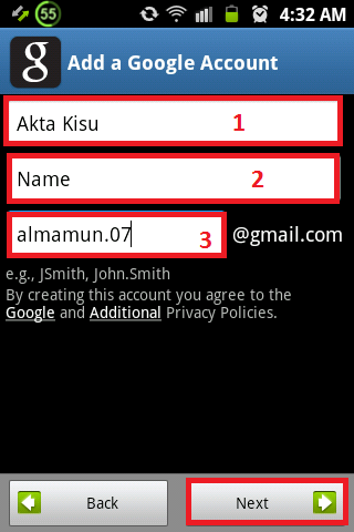 ১ নং বক্সে first name ২ নং বক্সে last name এবং ৩ নং বক্সে username লিখে next Click করুন।