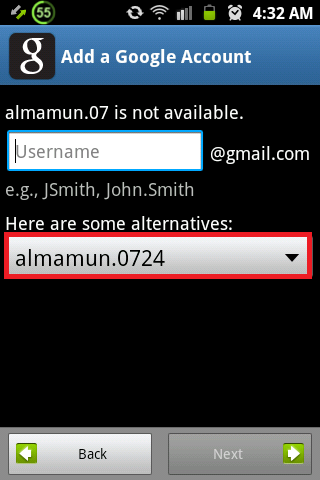 আমি আমার নাম দিয়েছিলাম, কিন্তু এই ইউজার নেম গুগল একসেপ্ট করেনি তাই আমাকে Suggetion দিয়েছে। Here are some alternatives থেকে আমার ইউজার নেম বাছাই করেছি। এবং Next ক্লিক।