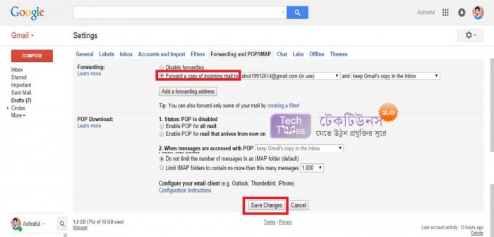 এখন আপনার ইমেইল Forwarding Disable আছে Enable করতে চাইলে Forward a copy of incoming mail to টিক দিয়ে নিচে Save Change এ ক্লিক করুন। তাহলেই ইমেইল Forwarding Enable হয়ে গেল। নিচের মতো