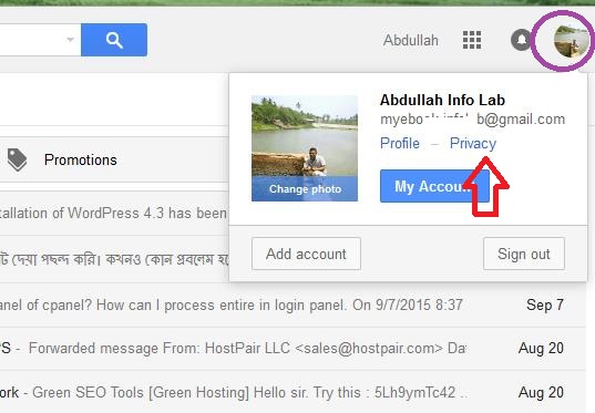 ১। প্রথমে আপনার জিমেইল একাউন্টে লগইন করুন > মেইল একাউন্টের উপরে ডান পাশের প্রফাইল আইকন হইতে Privacy অপশনে ক্লিক করুন।