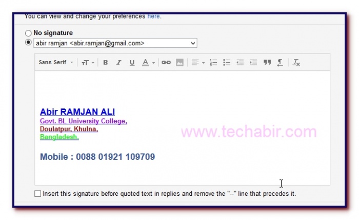 এই বক্সে মেইলের সাক্ষর করে রাখতে পারবেন। অর্থাৎ কাউকে মেইল করার সময় প্রত্যেকবার আপনার নাম, ঠিকানা ও মোবাইল নং লেখার প্রয়োজন হবে না।