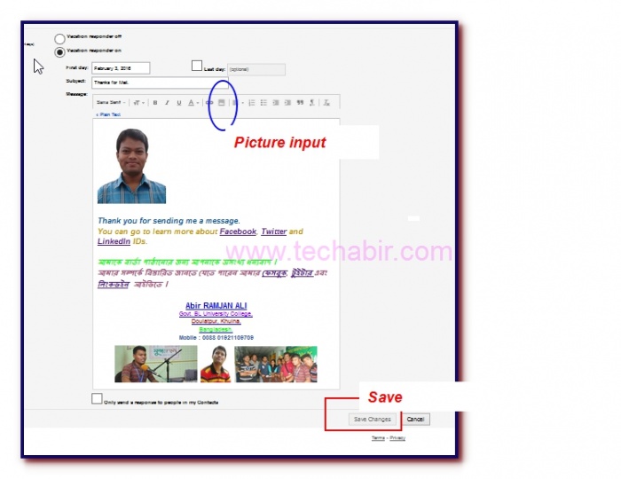 এরপর সেভ করুন। এখন যে কেউ মেইল করলে তাকে অটোমেটিক জিমেইল আপনার সেট করা মেইলটি তাকে পাঠিয়ে দেবে।