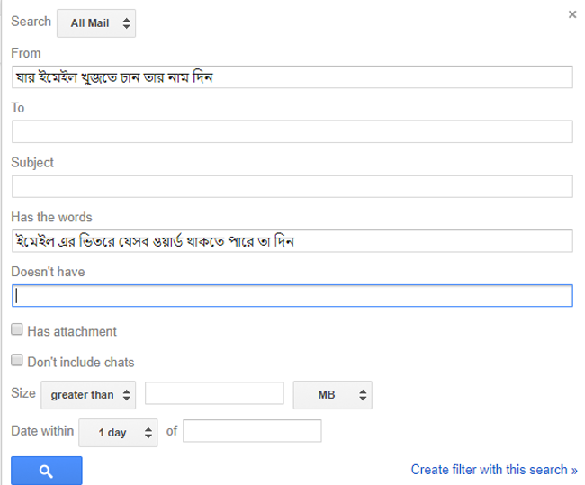 নতুন যে উইন্ডোটি ওপেন হয়েছে সেখানে আপনি অনেকগুলো অপশন পাবেন সেই অপশনগুলোর মধ্যে প্রথমেই দেখতে পাবেন “From” নামে একটি ফাকা ঘর আছে। সেখানে যার থেকে ইমেইলটি এসেছে তার নাম দিন। যদি না জানেন তাহলে ফাকা রাখুন। এবার দেখুন একে কে “To” এবং “Subject” নামে আরো দুইটি ফাকা ঘর আছে। এখানে আপনি “Subject” এর ঘরে ইমেইল এর সাবজেক্টটি জানেন তাহলে তা দিন। আর দেখুন শেষে দুইটি ঘর আছে একটি হল “Has the words” অন্যটি হল “Doesn’t have” এই দুইটি ঘরের প্রথমটিতে আপনি ইমেইল এ আছে এমন লাইন বা শব্দ দিতে পারেন এতে ইমেইলটি খুঁজে পেতে সুবিধা হবে। এর পরের ঘরে ইমেইল এ নেই এমন লাইন বা শব্দ যুক্ত করতে পারেন। এতে গুগল তারাতারি আপনার কাঙ্ক্ষিত ইমেইল খুঁজে পাবে।