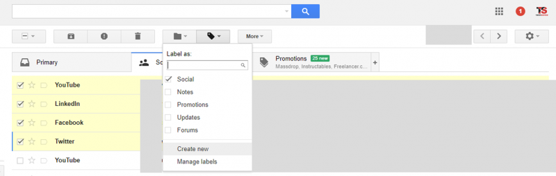 আমরা যেমন বিভিন্ন ফোল্ডারে নানা ধরনের ফাইল রাখি তেমনি জিমেইল এও এরকম করা সম্ভব। কিন্তু জিমেইল এ ফোল্ডার এর বদলে লেবেল আকারে বিভিন্ন ইমেইল একসাথে করা হয়। এর জন্য প্রথমেই জিমেইল এর ইনবক্স এ যেতে হবে তারপরে যেই ইমেইল গুলোকে আলাদা করতে চান অর্থাৎ লেবেল এ রাখতে চান সেগুলোকে সিলেক্ট করুন। যেমন আমি নিচে কিছু ইমেইল সিলেক্ট করেছি। এর পরে উপরে দেখুন একটি বাটন আছে লেবেল এর সেটিতে ক্লিক করুন।