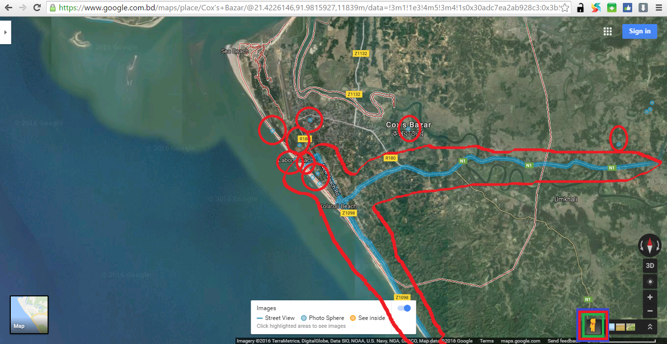 ৪। এবার সৈকত নিশ্চয়ই দেখতে পাচ্ছেন ম্যাপে? কিন্তু আমরা তো দেখতে চাই আরো উচ্চমানের ভিউ তাই না? একটু জুম করুন। বেশি না, বেশি করলেও সমস্যা নাই, না করলেও নাই। তবে একটু জুম করলে সুবিধা হবে। এখন একটু কষ্ট করে নিচের মানুষটাকে ধরে টানুন(চিত্রে দেখুন)। টানলেই দেখবেন অনেক রাস্তায় আকাশি দাগ বা গোল চিহ্ন দেখছেন। যে জায়গার স্ট্রীট ভিউ দেখবেন সেখানে মানুষটিকে ড্রপ করুন। অবশ্য সবগুলো স্ট্রীটের না। সৈকতসহ বিভিন্ন জায়গার ভিউ আছে। কোন সমস্যা যেন না হয় তাই নিচের ছবিতে মার্ক করে দিলাম-