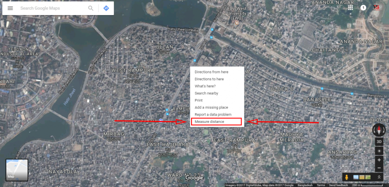 তারপরে আপনি যেই এলাকা অর্থাৎ পয়েন্ট থেকে অন্য পয়েন্টের দূরত্ব নির্ণয় করতে চান সেই এলাকা খুঁজে বের করুন। তারপরে ঠিক মত যুম করে নির্দিষ্ট পয়েন্ট ঠিক করে নিন। তারপরে রাইট ক্লিক করে “Measure distance” নামের অপশনটিতে ক্লিক করুন।