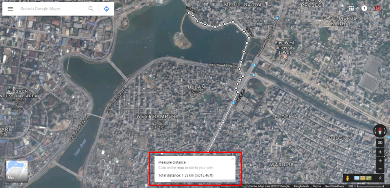 এবার যেই জায়গা থেকে যেই জায়গার দূরুত্ব মাপ্তে চান সেই দুই জায়গা সিলেক্ট করুন। এর জন্য শুধু মাত্র জায়গা দুইটির উপর ক্লিক করলেই হবে। আপনি চাইলে একসাথে অনেক পয়েন্ট এর দূরুত্ব নির্ণয় করতে পারবেন। নিচের ছবিটা দেখলেই আশা করি বুঝে যাবেন।
