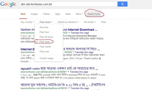 আপনি idm সম্পর্কে তথ্য জানতে চান। techtunes.io এই ওয়েবসাইট এ গত সাত দিনে কি টিউন হয়েছে তা জানতে চান( idm নিয়ে সবাই ঝামেলায় থাকে তো তাই 😆 )। তাহলে যথানিয়মে idm site:techtunes.io লিখে সার্চ দিন। এখন যেসব তথ্য এসেছে তা বিভিন্ন সময়ের। আপনি আপডেটেড তথ্য চান। তাহলে নিচের চিত্রের মত Search tools এ ক্লিক করুন। ক্লিক করা মাত্রই নিচে আরেকটি মেনুবার এসেছে। আপনি এই মেনুবার থেকে Anytime এর জায়গায় Past week সিলেক্ট করুন। এই মেনুবার টি ব্যাবহার করে আপনি আরও ফিল্টারিং করে (নিদিষ্ট দেশের, নিদিষ্ট সময়ের) তথ্য পেতে পারেন।