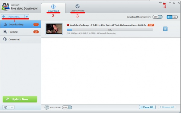 এখন ইউটিউব থেকে যে ভিডিও টি Subtitle সহ Download করতে চান সেটি চালিয়ে দেবার পর তার লিংক টা এড্রেসবার থেকে কপি করে iSkysoft Free Video Downloader এ নিচের স্ক্রিন শট এর ১নং লাল আন্ডার লাইন এর ওপর Paste URL লেখাতে ক্লিক করুন। এরপর সফটওয়্যারটি লিঙ্কটির ভিডিও সার্চ করতে থাকবে। সার্চ করা হলে ভিডিওটি ডাউনলোড শুর হবে।