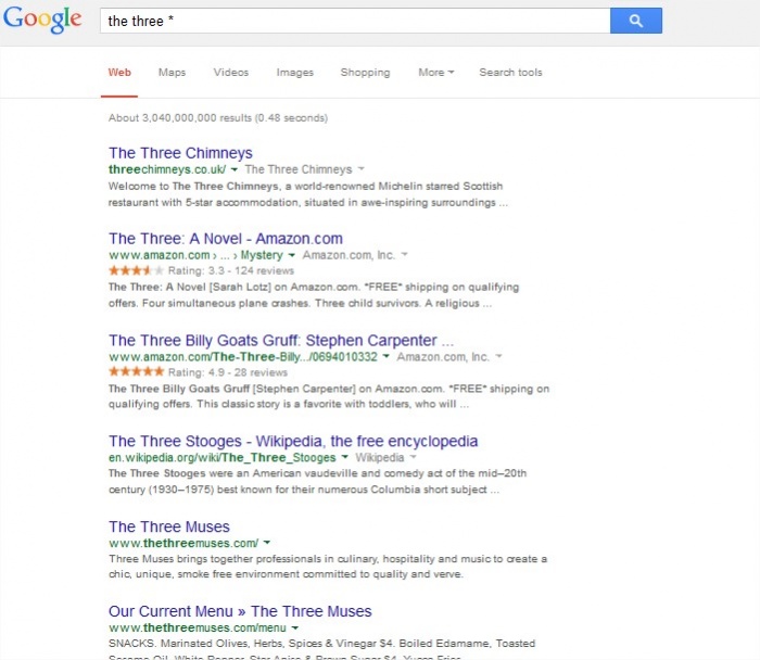 এখন আপনি হয়ত যে বিষয়ে সার্চ করবেন তার পুরো স্পেলিংটা বা বানানটা জানেন না। এখন কীভাবে সার্চ করবেন ? এর জন্য বিশেষ পদ্ধতি রয়েছে। আপনি ধরুন আপনার সার্চের বিষয়ের শুধু the three এইটুকু জানেন। আর বাকীটুকু জানেন না। এখন জাস্ট এই কীওয়ার্ডের শেষে একটা * চিহ্ন যোগ করে দিন। তাহলেই গুগল ওই কীওয়ার্ডের সাথে যুক্ত সব সার্চ রেজাল্ট আপনার সামনে এনে হাজির করবে। যেমন :