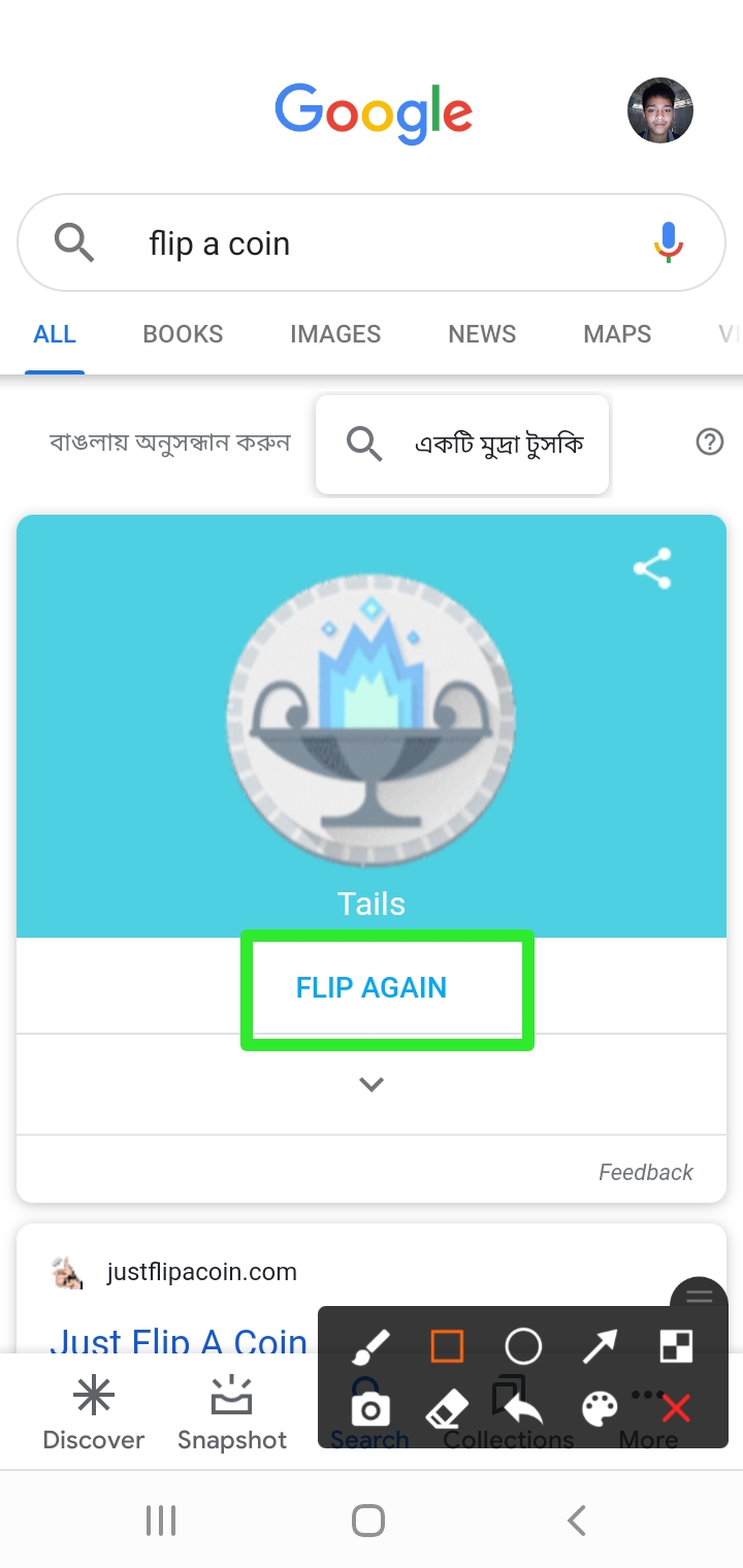 সার্চ দিলেই এসে যাবে টস করার অপশন। সত্যিকারের টস করা, কয়েনের ঝামেলায় যেতেই হবে না আপনাকে।
