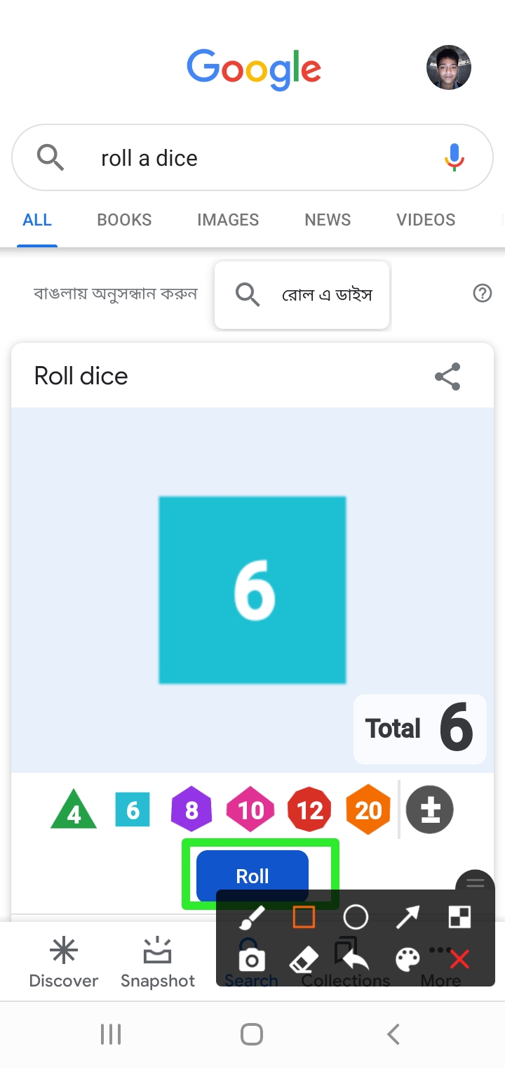 কিন্তু লুডো খেলতে গিয়ে আমরা অনেক সময় ছক্কা যদি হারিয়ে ফেলি? কোন সমস্যা নেই, টস করার মতো ছক্কার সমস্যাও মিটিয়ে দিতে পারবে গুগল। এজন্য আপনাকে গুগল সার্চ বারে গিয়ে লিখতে হবে Roll a dice।