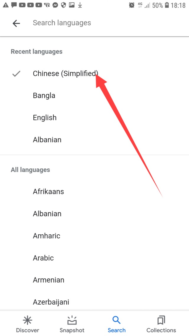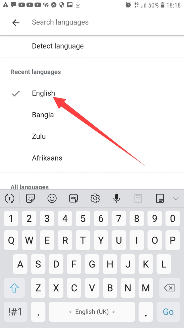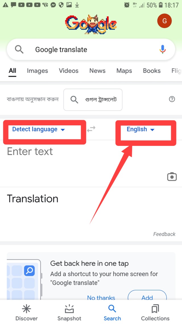১. প্রথমে আপনি আপনার ফোনের গুগল অ্যাপ এ প্রবেশ করবেন এবং সার্চ বারে গিয়ে লিখবেন Google translation। তারপর আপনাকে গুগল তাদের ওয়েব পেজটি ওপেন করে দেবে। আপনাকে এক্সট্রা করে কোন ওয়েবসাইটে ঢুকতে হবে না কারণ এটি গুগলের একটি ফিচার্স। যার কারণে আপনি সার্চ দিলে প্রথম পাতায় আপনি এটি পেয়ে যাবেন এবং সেখান থেকে আপনাকে সিলেক্ট করতে হবে যে আপনি কোন ভাষা থেকে কোন ভাষায় রূপান্তরিত করতে চাচ্ছেন। এর জন্য আপনি 2 টি সিলেক্ট করার অপশন পাবেন। প্রথম অপশনে ক্লিক করবেন।