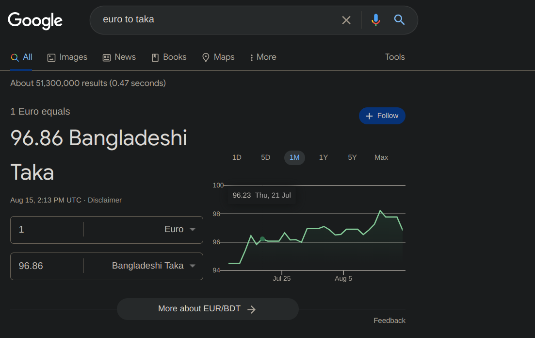 অনেক সময় আমাদের কোন দেশের টাকার মুল্য কত এবং কোন দেশের টাকার মান কম বা বেশি এমনটা আমাদের জানার প্রয়োজন হয়। সেজন্য গুগল দিচ্ছে আপনাদের কে কারেন্সি নির্নয় করার ক্যালকুলেটর। অর্থাৎ আপনি কোন দেশের কত টাকা অন্য কোনো দেশের কত টাকা হয় সেটা আপনি গুগলের একটি ছোট্ট ভার্চুয়াল মেশিনের মাধ্যমেই নির্নয় কর্তে পারবেন। এর জন্য আপনাকে গুগলে যেয়ে শুধুমাত্র Currency লিখে সার্চ করতে হবে। তাহলেই সেই ক্যালকুলেটর টি আপনার সামনে এসে পড়বে।