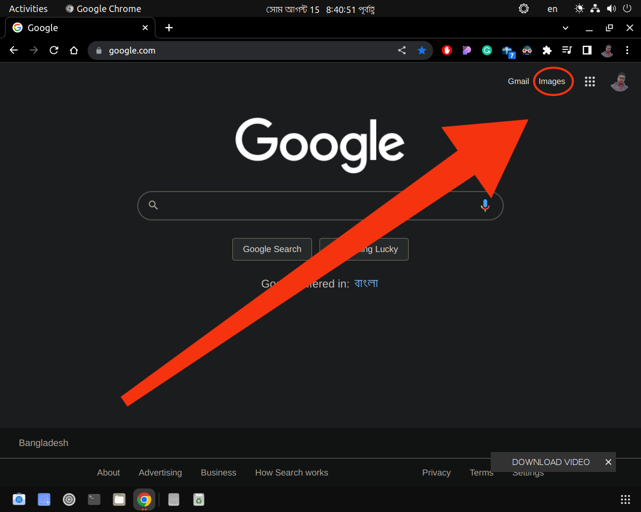 আপনি চাইলে ইমেজ টি গুগলে সার্চ করতে টেক্সট না করেই। সেক্ষেত্রে আপনাকে প্রথমে গুগলে যেতে হবে। এবং ডানপাশে উপরের কর্নারে images লেখা আছে সেটাতে ক্লিক করবেন।