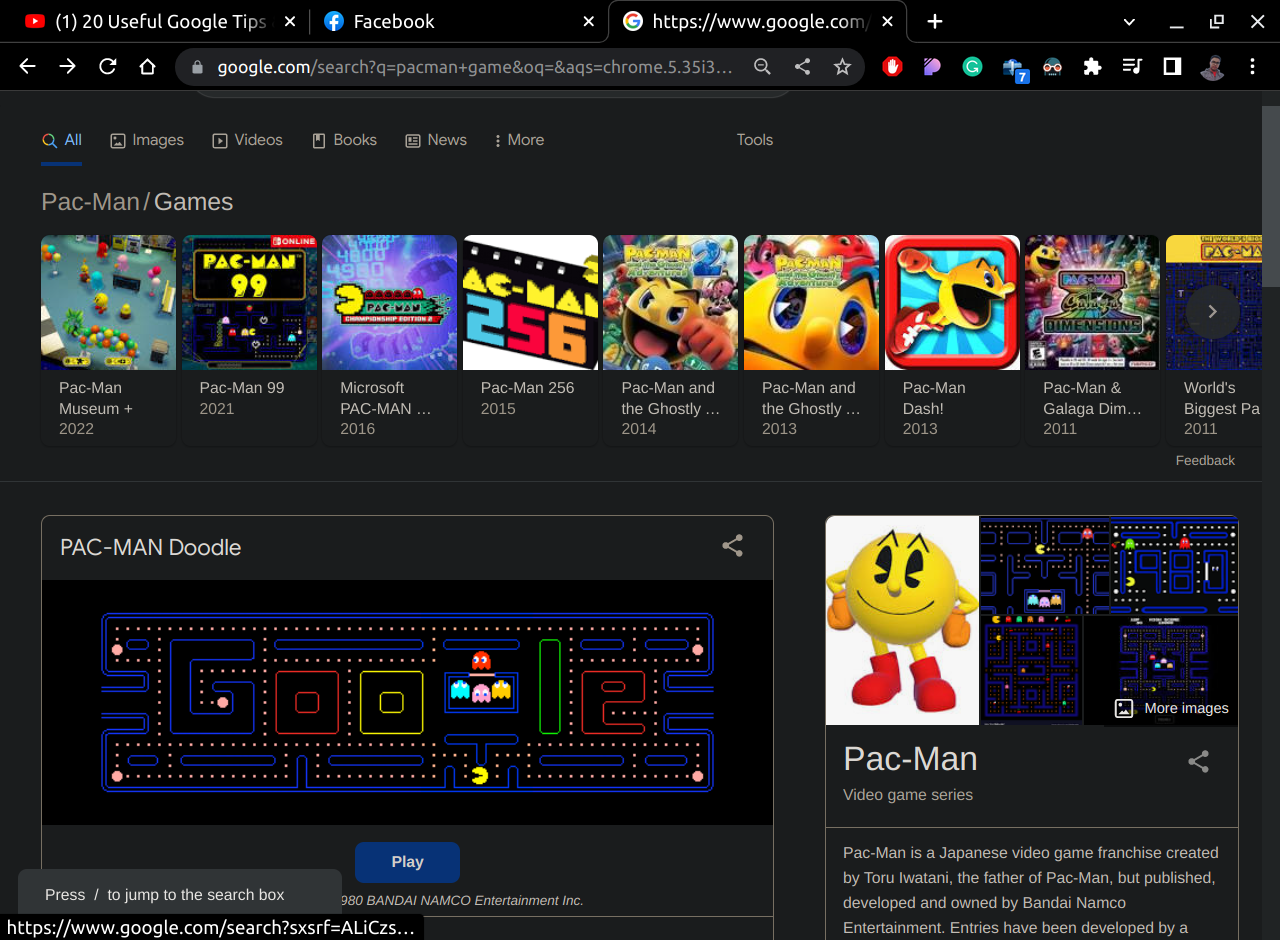 আপনারা অনেকের হয়তো একটানা অনেকক্ষণ ইন্টারনেট ব্যবহার করতে করতে ক্লান্ত হয়ে জান। কিছুক্ষন রেস্ট এ থাকতে চান। এমন সময় এ আপনি চাইলে গুগলে আসতে পারেন। Pacman Game Search দিন। এরপর play বাটনে ক্লিক করে গেম খেলতে থাকুন। নিচে থেকে আপনারা অন্য কোনো গেম ও খেলতে পারবেন।