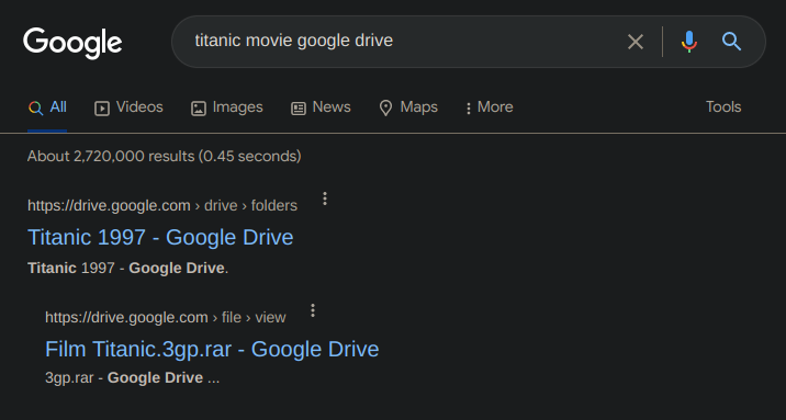 দেখবেন আপনার পছন্দের মুভিটির Google Drive লিঙ্ক আপনার সামনে এসে পড়েছে। ইহা বেশীরভাগ ক্ষেত্রেই কার্যকর। যদি কেউ তাঁর সেই মুভির গুগল ড্রাইভ লিঙ্ক কোনো পাবলিক টিউনের মাধ্যম এ শেয়ার করে থাকে তাহলে চলে আসবে আপনার কাছেও।