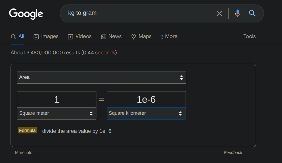 আপনি কি ওজন বা এরিয়া বা তাপমাত্রা বা দৈর্ঘ্য ইত্যাদির একক গুলোর পরিমাপ সম্পর্কে জানতে চান? তাহলে গুগলে যেকোনো দুইটি একক এর নাম লিখে সার্চ দিন। এতে পরিমাপের সমস্ত হিসাব নিকাশ একটি ক্যালকুলেটর এর মতো করে আপনাদের সামনে আসবে। এবং চাইলে সবকিছু পরিবর্তন ও করে অন্য কোনো পরিমাপের সম্পর্কে জানতে পারবেন।