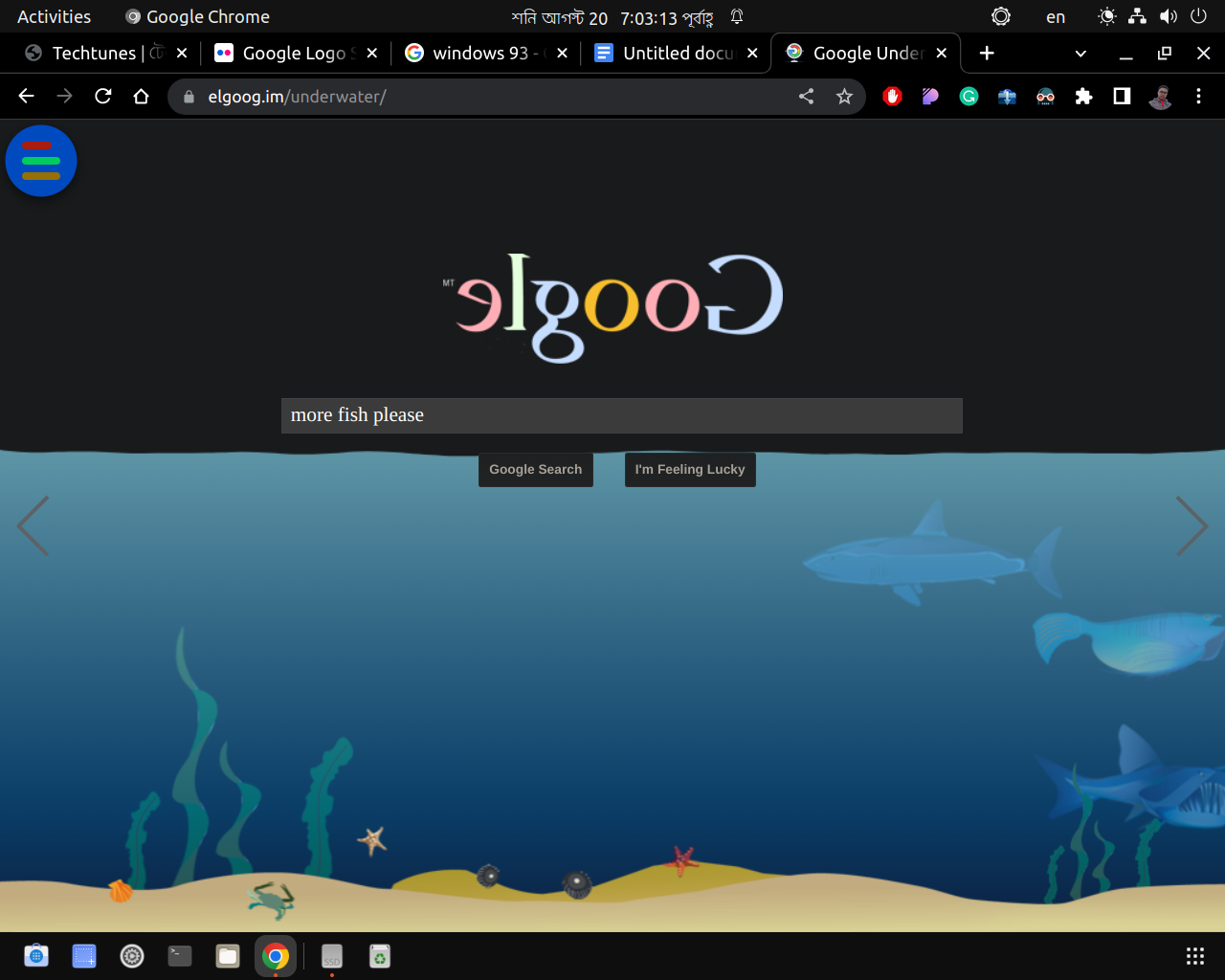 কেমন হয় যদি আপনি গুগল কে পানির মধ্যে দেখতে পান। শুধু তাই নয়। ব্যাপারটা যদি এমন হয় যে মাছেরা গুগলের সার্চ বার নিয়ে খেলা করছে। এমনটা দেখতে হলে Google Underwater লিখে সার্চ করুন। এরপর প্রথম লিঙ্কে ক্লিক করুন।
