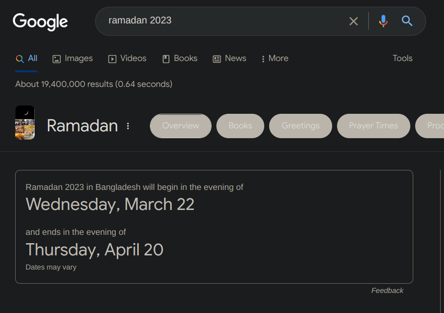 আপনি কি কোনো ধর্মীয় উৎসব বা কোনো জাতীয় উৎসব বা কোনো দিবস সম্পর্কে জানতে চান? গুগলে যেয়ে সেই দিবস টির নাম ও সাল লিখে সার্চ করে দিন। দিবসের তারিখ টি গুগলে সবার সামনে ও উপরে বড় করে লেখা উঠে যাবে।