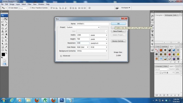 এ পর্বে আমরা গ্লাস এফেক্টের মাধ্যমে কিভাবে সুন্দর একটি ওয়ালপেপার তৈরী করা যায় তা দেখব। প্রথমে আপনার মনিটরের রেজুলেশন অনুযায়ী পিক্সেল দিয়ে নতুন ফাইল খুলুন আমি ১৩৬৬* ৭৬৮ পিক্সেল ও রেজুলেশন ৩০০ ব্যবহার করেছি।