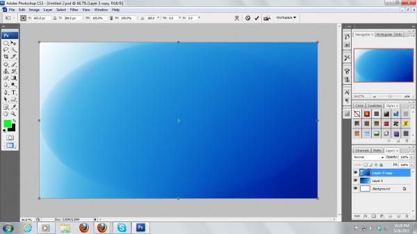 এখন দু'টি লেয়ার মার্জ করতে হবে। এবার লেয়ারের একটি কপি করে ট্রান্সফর্ম টুলের সাহায্যে নতুন লেয়ারকে ঘুরাতে হবে (ছবির মত)। এখন যে কোন লেয়ারের (CTRL+U) হিউ সারচুয়েশন কমিয়ে লেয়ার দু'টির মধ্যে রংয়ের সামান্য পার্থক্য করতে হবে।