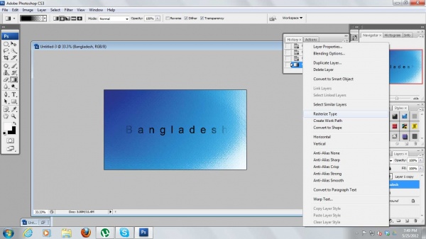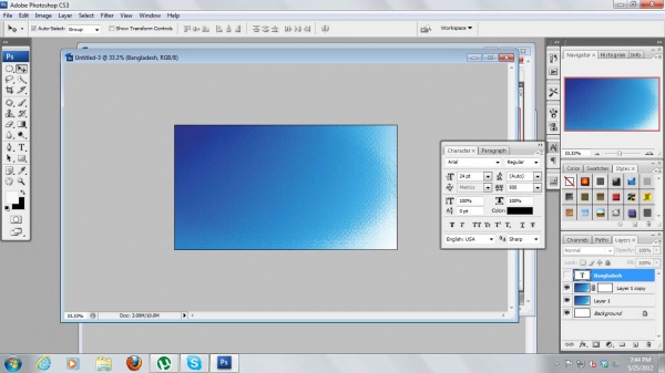 এবার Type টুলের সাহায্যে আপনার পছন্দমত লেখা যোগ করুন। এবং লেয়ারটিকে টেনে নিচে নিয়ে আসুন (Change Layer Order) । এখন উপরের লেয়ার মাস্কিং করে radial gradient টুল দিয়ে (ব্যাকগ্রাউন্ড কালার কালো) এমনভাবে ড্রাগ করুন যাতে আপনার লেখার ডান-বাম উভয়দিকের প্রান্ত কিছুটি ঝাপসা থাকে।