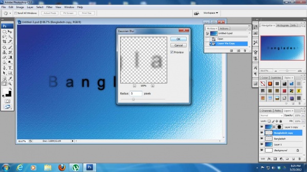 লেখাকে অবশ্যই Rasterize করে লেয়ারকে কপি করে নিচের লেয়ারে Filter > Blur > Gaussian Blur প্রয়োগ করুন (আমি এর মান ৫ ব্যবহার করেছি)