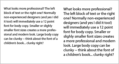 ডিজাইনার, নন-ডিজাইনাররা প্রত্যেকেই সাধারনত বডি টেক্সেট এর জন্য ফন্টের ১২ সাইজটি ব্যবহার করে থাকেন। ফন্টভেদে এটি কিছুটা ছোট বড় হতে পারে। তবে আমাদের খেয়াল রাখতে হবে বডি টেক্সট এ িবেশি বড় সাইজ ভালো দেখায়না। তবে এটা খেয়াল রাখতে হবে মনিটরে লেখাকে আমরা যতটুকু দেখি প্রিন্ট করার পর আরেকটু বড় মনে হবে।আবার প্রিন্টার নির্দেশনা িএরকম যে ফন্ট সাইজ যেন ৭ এর কম না হয়। ৭ এর কম হলে আবার পড়তে সমস্যা হতে পারে।চিত্রটি দেখুন-