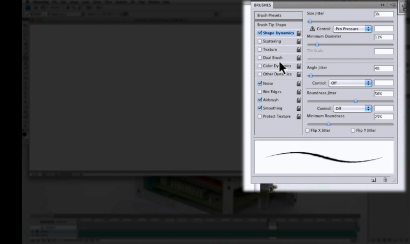 এখন Brush অপশনের Shape Dynamics নিয়ে কাজ করব, এখানে size Jitter = 3%, Minimum Diameter= 11%, Angle Jitter= 4%, Roundness Jitter= 56% এবং Minimum Roundness= 25% এই সেটিং টি নিতে হবে।