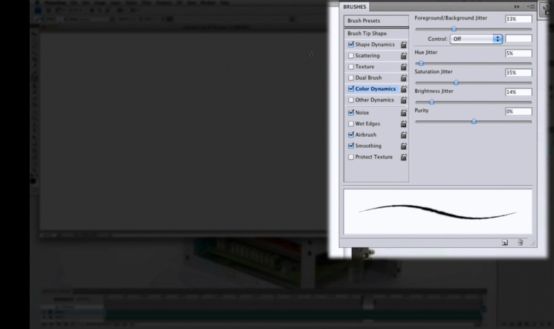 এখন আমরা Brush অপশনের color Dynamics যাব। এখানে আমরা Foreground/Background Jitter =33%, Hue Jitter= 5%, Saturation jitter= 35%, Brightness Jitter= 14%, Purity= 0% এই সেটিং টি করে নিব।