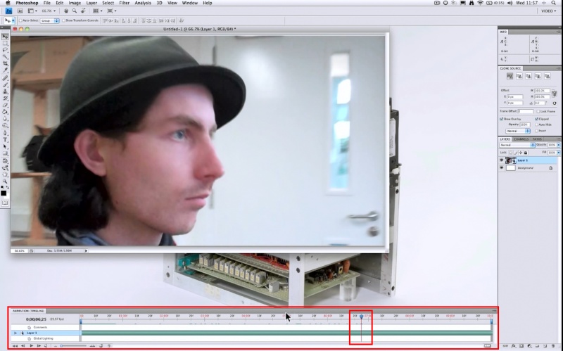 ১. এই ইফেক্টি বানানোর প্রথমে আমরা ফটোশপটি কে একটু গুছিয়ে নিব যেহেতু আমরা Animation নিয়ে কাজ করতেছি তাই আমরা ফটোশপকে আমরা তার ভিডিও মুডে নিয়া আসব। এই কাজটি করার জন্য প্রথমে ফটোশপের windows মেনু থেকে workspace তারপর Video সিলেক্ট করতে হবে। তাহলে ইন্টারফেসটি ঠিক এই রকম দেখাবে।নিচের বিশেষ অংশটিকে বলে টাইমলাইন, ফটোশপে ভিডিও এবং Animation নিয়ে কাজ করার জন্য এই টাইমলাইন অনেক গুরুত্বপূর্ন।