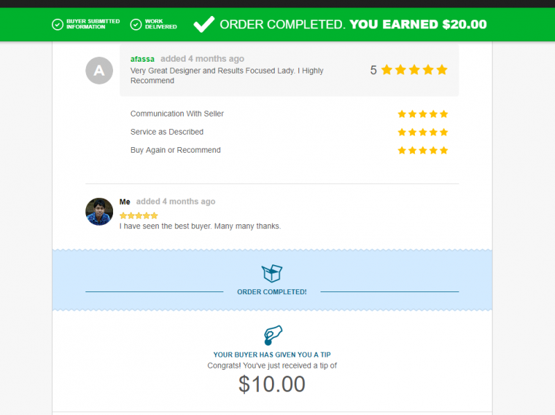 এই কস্টেস্ট উইন করার পর আমি যে কি পরিমান খুশি হয়েছিলাম সেটা বলে বুঝানোর মত না। তারপর থেকে কাজের প্রতি আরও বেশি করে সময় দিতে থাকলাম। তারপর আমি তাদের কথামত ফাইভারে অ্যাকাউন্ট খুলি। সেখানে অনেক অনেক টিপস দেয়া আছে। আমি মাত্র ৪ দিনের মধ্যেই ফাইভারে প্রথম কাজ পেয়ে যাই। তাদের ডিভিডি তে থাকা ফাইভার নিতে ভিডিও গুলোতে অনেক সুন্দর করে দেখানো আছে কিভাবে কাজ পেতে হবে কিভাবে কাজ করতে হবে কিভাবে কাজ করার পর সাবমিট করতে হবে থেকে শুরু করে সব কিছু। আমি সেই কাজটি সফলতার সাথে শেষ করি। এবং বায়ার আমাকে ৫ স্টার দেয়। মাত্র ১৫ ডলারের কাজ ছিল কিন্তু বায়ার খুশি হয়ে আরও ১০ ডলার দেয়। নিচে ফাইভার থেকে আমার প্রথম ইনকাম তুলে ধরলাম।