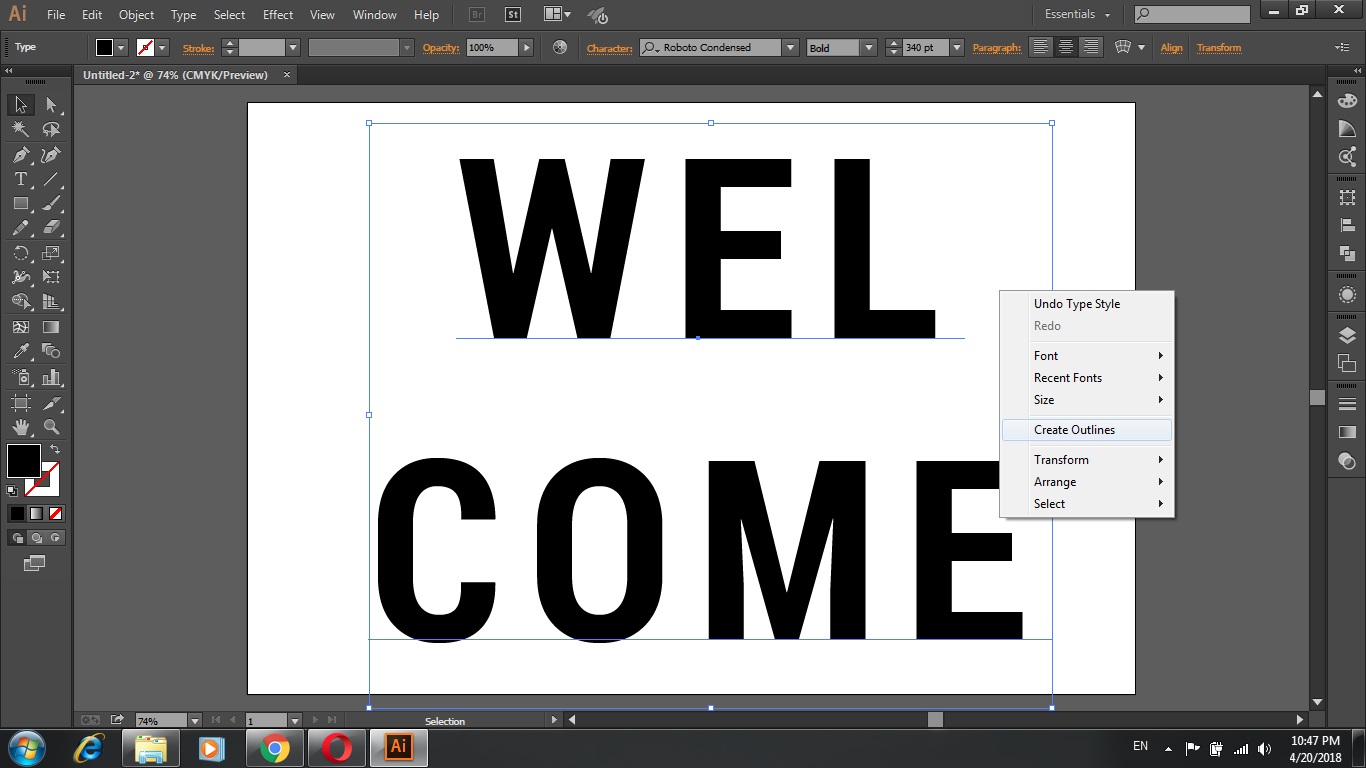 প্রথমে, অ্যাডবি ইলেস্ট্রেটর সফটওয়্যার ওপেন করি এবং নিউ ডুকুমেন্ট নিয়ে, টেক্সট টুলের মাধ্যমে wel-come লিখে ফেলি। তারপর ফন্টি সিলেক্ট থাকা অবস্থায়, মাউসের ডান বাটনে ক্লিক করলে অপশন বক্স আসবে। অপশন থেকে create outilnes অপশন ক্লিক করে ফন্ট গুলোকে আন-গ্রোপ করে নিতে হবে।