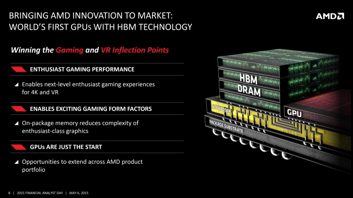 কিছুদিন পর এএমডি HBM (High Bandwidth Memory) নামে এক টাইপের মেমরী নিয়ে আসছে, এটি নতুন ধরনের এক মেমরী চিপ যেটি GDDR5 এর চেয়ে ৯ গুন দ্রুত বলে দাবী করা হচ্ছে, যা কার্ডের পার্ফরম্যান্সে এক বিপ্লব নিয়ে আসবে বলে ধারনা করা যাচ্ছে, যা মেমরী পাওয়ার কনসাম্পশন ও অনেক কমিয়ে দিবে।