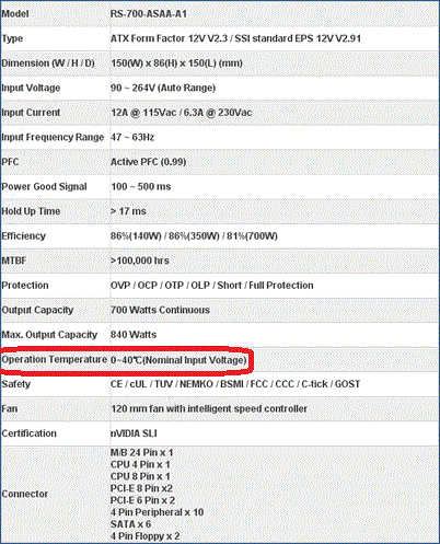 প্রত্যেকটা পাওয়ার সাপ্লাই ইউনিট এর গায়ে তার ম্যাক্সিমাম রেটেড পাওয়ার লেখা থাকে, এটা পুরোটাই থিইরিটিক্যাল। কোন পাওয়ার সাপ্লাই ই রেটেড পাওয়ার সাপ্লাই দিতে পারেনা, কিছু না কিছু কম থাকে। প্রতিটি পাওয়ার সাপ্লাই এর একটা টেম্পারেচার রেটিং থাকে,