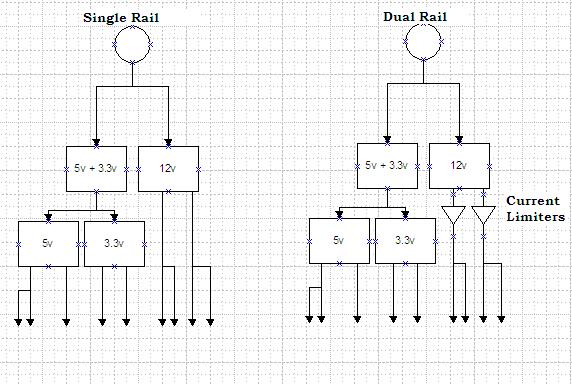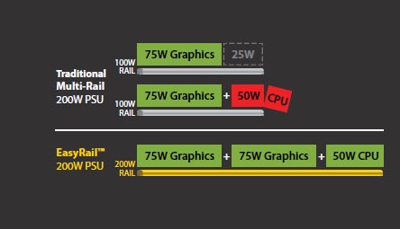 ধরা যাক দুইটি +12V রেইল সম্পন্ন একটি পাওয়ার সাপ্লাই এ একটি +12V রেইলে ম্যাক্সিমাম 25A কারেন্ট ফ্লো করতে পারে মানে ৩০০ ওয়াট পাওয়া যায় এবং আরেকটি +12V রেইলে ম্যাক্সিমাম 20A কারেন্ট ফ্লো করতে পার মানে ২৪০ওয়াট পাওয়া যায়। দুই রেইল মিলিয়ে ৫৪০ ওয়াট পাওয়ার সাপ্লাই হওয়ার হিসাব থাকলেও সর্বোচ্চ ৫০৪ ওয়াট সাপ্লাই হতে পারে। এখন প্রথম রেইলে যদি ৩০০ ওয়াট ইউজ হয় অন্য রেইলে (৫০৪-৩০০) = ২০৪ ওয়াট পাওয়া যাবে মানে 21A এর বদলে 17A কারেন্ট ফ্লো করবে তখন।