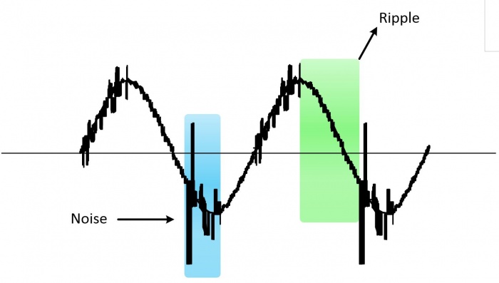যাই হোক oscilloscope দিয়ে দেখলে ভোল্টেজের এইরকম oscillation দেখা যায় অনেকটা AC ভোল্টেজের মত, একে (Ripple) রিপল বলা হয়, আর এই oscillation এর উপরের দিকে কিছু Spike (স্পাইক) দেখা যায় একে (Noise) নয়েজ বলে।