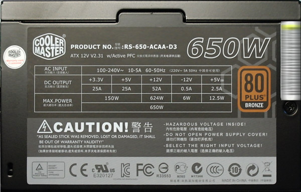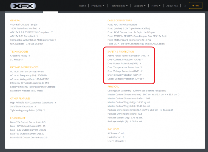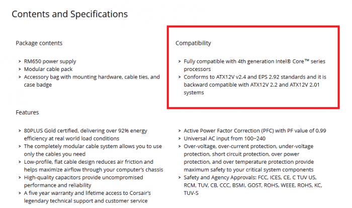 বলা আছে পাওয়ার সাপ্লাই ইউনিটটি ATX12V v2.4 এবং EPS 2.92 স্ট্যান্ডার্ড। এর মানে এই দুই স্ট্যান্ডার্ডে যত রকম কানেক্টর ক্যাবল থাকার কথা, এই পাওয়ার সাপ্লাই ইউনিটির তা আছে, এবং ATX12V এর আগের দুটি স্ট্যান্ডার্ডের সিস্টেমের (ATX12V v2.2, ATX12V v2.01) সাথেও ম্যাচ করবে।