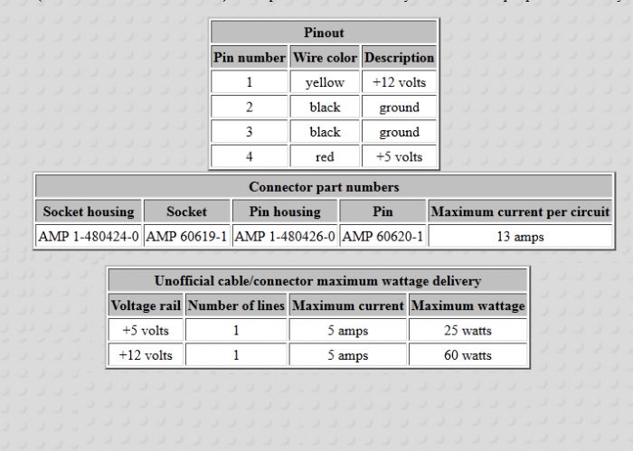 3.5" ফ্লপি ড্রাইভ গুলা এই ক্যাবলের মাধ্যমে পাওয়ার কালেক্ট করতো। পুরানো AGP কার্ডেও অতিরিক্ত পাওয়ার সাপ্লাই করা যেতো এটি দিয়ে।