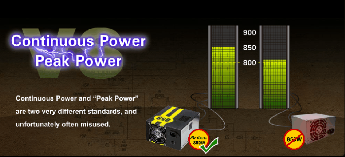 এইটা এক এক কোম্পানীর এক এক রকম মার্কেটিং পলিসি, কিছু কোম্পানীর পিএসইউ পাওয়ার রেটিং Peak power এ দেয়া থাকে, সহজ ভাবে বলতে গেলে Peak power হচ্ছে একটি পাওয়ার সাপ্লাই ইউনিট সর্বোচ্চ কত ওয়াট পাওয়ার সাপ্লাই দিতে পারে, এই Peak power কয়েক সেকেন্ডের জন্য স্থায়ী হয়। আর Continuous Power হচ্ছে পাওয়ার সাপ্লাই ইউনিট বেশিরভাগ সময় কত ওয়াট পাওয়ার সাপ্লাই দিচ্ছে। যেমন একটি পাওয়ার সাপ্লাই বেশিরভাগ সময় ৬৫০ ওয়াট বা তার কাছাকাছি সাপ্লাই দেয়। ওই পাওয়ার সাপ্লাইটি মাঝে মাঝে সর্বোচ্চ ৭০০ ওয়াট সাপ্লাই দিতে পারে মাত্র কয়েক সেকেন্ডের জন্য। তাহলে ওই পাওয়ার সাপ্লাই টির পাওয়ার রেটিং continuous power হিসাবে হবে ৬৫০ ওয়াট, আর peak power হিসাবে হবে ৭০০ ওয়াট। পাওয়ার সাপ্লাই ইউনিট কোম্পানি গুলা এই দুই ভাবে তাদের পাওয়ার রেটিং দিয়ে থাকে।