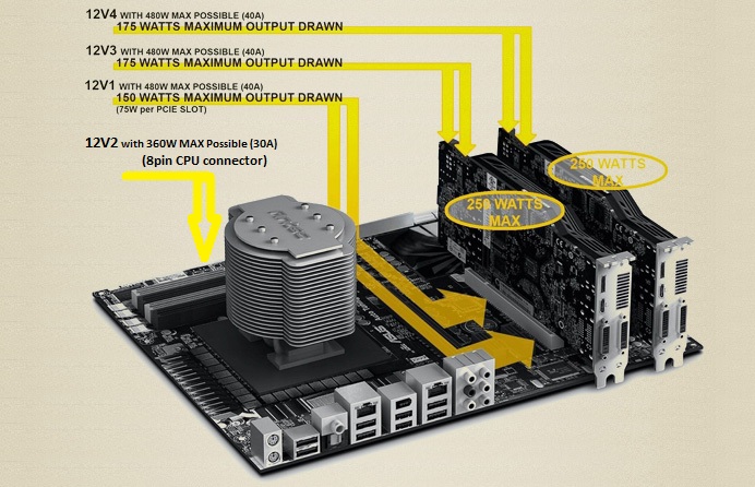 ২. দুটি PCIe slot এর জন্য একটা +12V2 রেইল, এই রেইলের জন্য বরাদ্দ 40A মানে ৪৮০ ওয়াট