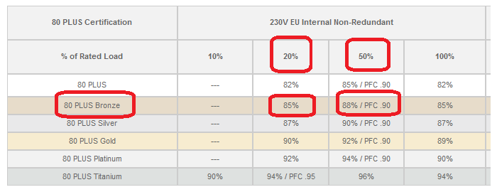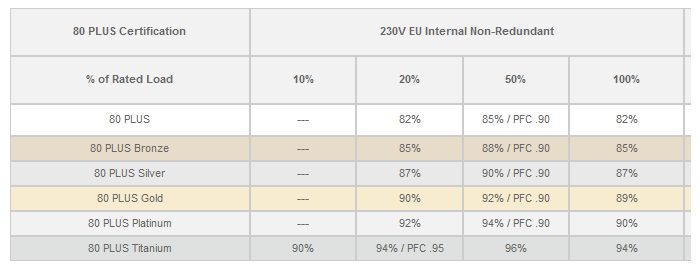 আমরা অনেক সময় দেখি পাওয়ার সাপ্লাই এর গায়ে লেখা থাকে 80+ অথবা 80+ Bronze অথবা 80+ Gold। টোটাল ৬ ধরনের সার্টিফিকেট আছে, উপরের সিম্বল গুলোর যেকোন একটি থাকলে বোঝা যাবে পাওয়ার সাপ্লাইটি 80plus অর্গানাইজেশন দ্বারা certified. নিচে একটি চার্ট দিচ্ছি যেটা দেখলে Certification সম্পর্কে হালকা আইডিয়া পাবেন। একটি পাওয়ার সাপ্লাই ইউনিটের কত পার্সেন্ট লোডে কত Efficiency এবং কত PFC থাকে সেটার উপর ভিত্তি করেই ক্যাটাগরি করা হয়, যেমন 80+ Gold ক্যাটাগরির PSU হতে হলে ২০% লোডে ৯০% Efficiency থাকতে হবে, ৫০% লোডে ৯২% Efficiency থাকতে হবে আর ১০০% লোডে ৮৯% Efficiency এবং সব মিলিয়ে 0.90 (PFC) থাকলে তবেই ওই পাওয়ার সাপ্লাই 80+ Gold Certified হবে।