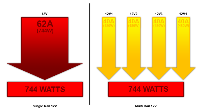উপরের চিত্রে দেখা যাচ্ছে +12V এর চারটা রেইল প্রতি রেইলে 18A করে হিসাবে আসে (12X18)X4=864Watt, কিন্তু সব +12V রেইল মিলিয়ে ম্যাক্সিমাম 680W পাওয়া যাবে। প্রতি রেইলে ম্যাক্সিমাম 216Watt এর উপর কোন কম্পোনেন্ট ইউজ করা যাবে না এই পাওয়ার সাপ্লাই ইউনিটে, যদি ২৫০ ওয়াটের একটি গ্রাফিক্স কার্ড লাগাতে চান তবে অন্য রেইলের একটি কানেক্টর এনে রান করাতে হবে। এই মাল্টি রেইল পাওয়ার সাপ্লাই গুলাতে অনেক লিমিটেশন থাকে। অবশ্য সামান্য কিছু সুবিধাও আছে, একটি রেইল যদি কোন ক্রমে নস্ট হয়ে যায় তাহলে অন্য রেইল এর কানেক্টর থেকে কনভার্টার দিয়ে পাওয়ার সাপ্লাই করা যায় যেটা সিঙ্গেল রেইলে করা যায় না। সেক্ষেত্রে পুরো পাওয়ার সাপ্লাইটি বাতিল হয়ে যায়। মাল্টি রেইলে কম্পোনেন্ট কানেকশন দেয়ার সময় খুব সতর্ক থাকা লাগে এবং দেখে দেখে কানেকশন দেওয়া লাগে যে কোন কোন রেইলে কোন কোন কম্পোনেন্ট গুলা কানেক্ট হচ্ছে, ক্যাবল ম্যানেজম্যান্ট ও অনেক জটিল হয়ে যায়।