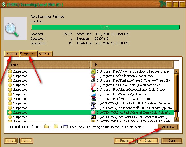 Scan করা শেষ হলে একটি ডাউলোক বক্সটি এ রকম আসবে যেখানে আমি লাল টির চিহ্ন দেওয়া আছে সেখানে Detected বা আর একটি হচ্ছে Suspected Scan করা শেষ হলে যে ফাইল গুলো ভাইরাস ধরছে সে গুলো all সিলেক্ট করে নিচে যে আছে Actহon নামে একটি অপশন আছে সেখানে Delete all লেখা আছে সেখানে ক্লিক করুন কাজ শেষ এখন আপনি কম্পিউটারটি রিস্টাট দিন চালু করুন আপনার আগের মতো স্বাভাবিক হয়ে গেছে।