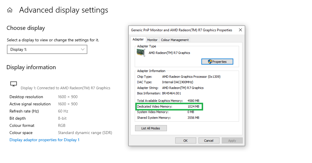 প্রথমে আপনার পিসির Settings এ যান এবার System এ ক্লিক করুন তারপর advanced Settings এ ক্লিক করুন সর্বশেষ ক্লিক করুন Display Adaptor Properties.। নতুন উইন্ডো থেকে দেখে নিন আপনার VRAM এর সাইজ কত।