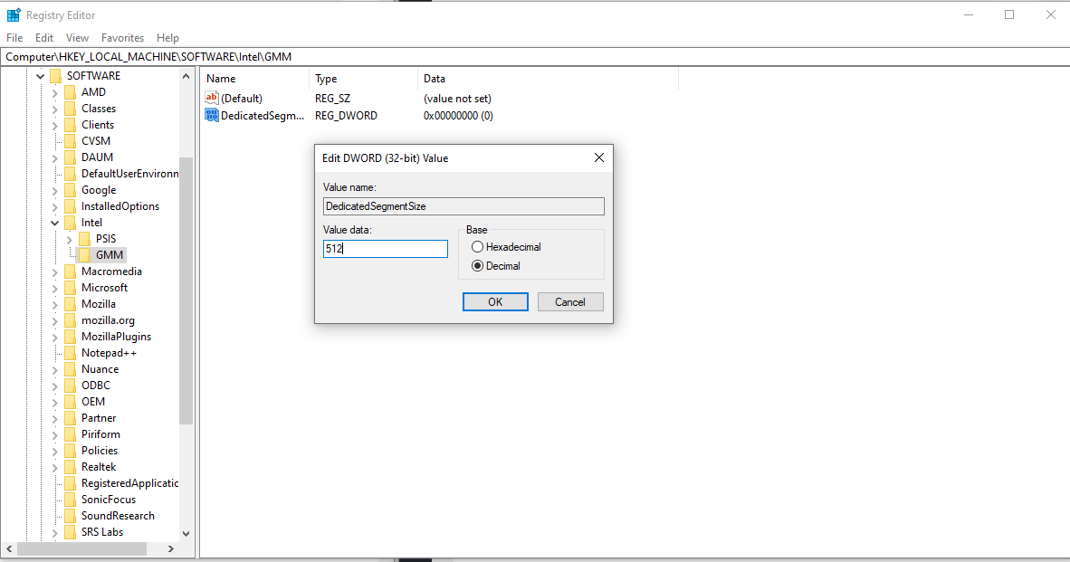 GMM ক্লিক করে ডান পাশে গিয়ে New > DWORD (32-bit) Value দিন। নাম দিন DedicatedSegmentSize এবং চাহিদা অনুযায়ী RAM এর সাইজ দিন। অবশ্যই Decimal সিলেক্ট করে দেবেন। কাজ হয়ে গেলে পিসি রি-স্টার্ট দিন।